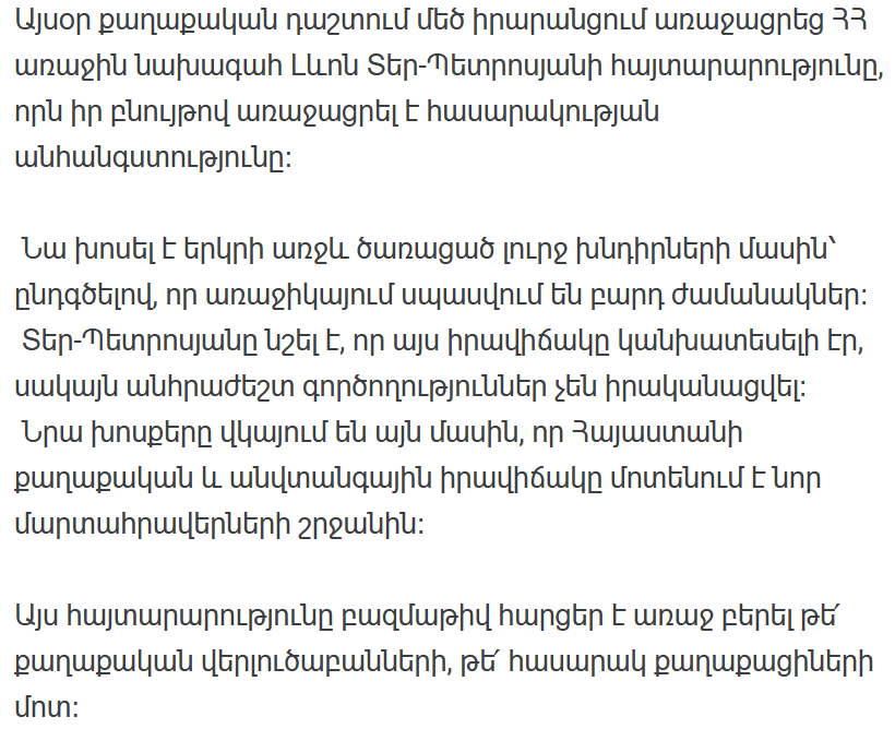 Многие считают, что слова Тер-Петросяна реалистичны, и что Армения столкнулась с серьезными проблемами, которые необходимо решать немедленно.