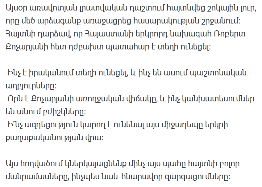 Инцидент с Робертом Кочаряном вызвал большую обеспокоенность, однако истинные причины до сих пор неясны.