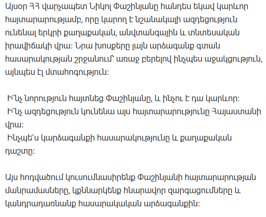 В этой статье мы рассмотрим детали заявления Пашиняна, обсудим возможное развитие событий и поразмышляем над реакцией общественности.