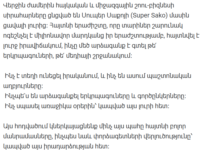 В последние дни в Интернете и СМИ активно циркулирует информация о том, что Супер Сако находится в сложной ситуации.