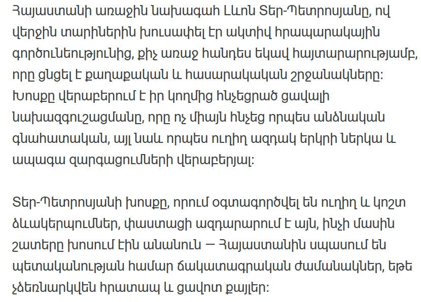 Речь Тер-Петросяна, в которой использовались прямые и резкие выражения, на самом деле озвучивает то, о чем многие говорили анонимно: Армению ждут судьбоносные времена для ее государственности, если не будут предприняты срочные и болезненные шаги.