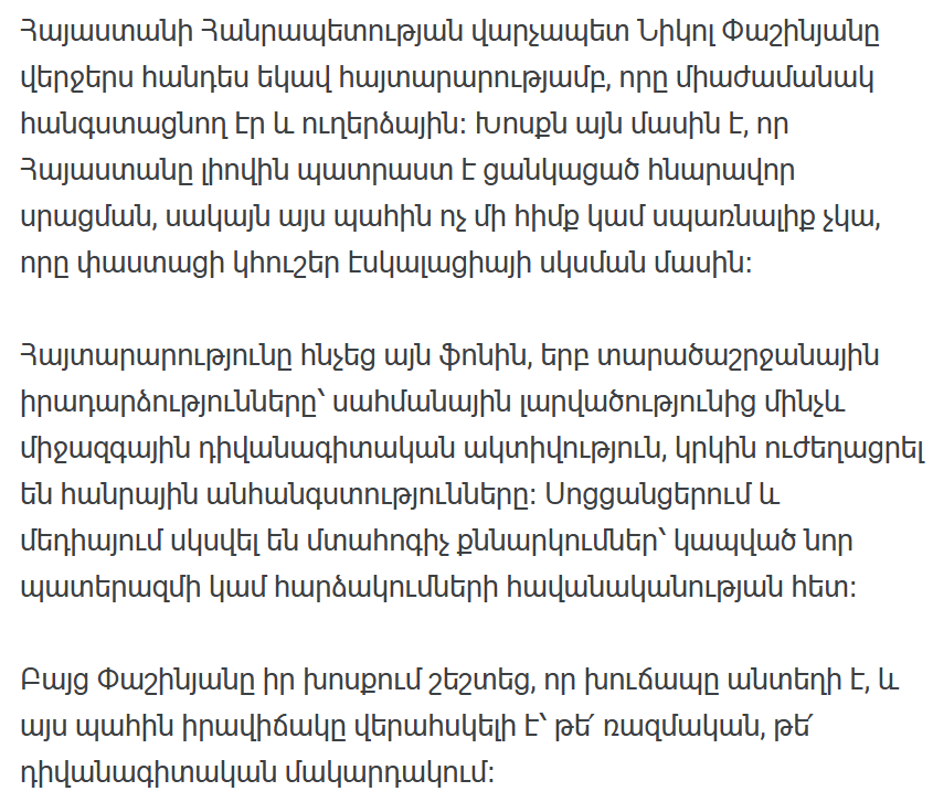 Премьер-министр Республики Армения Никол Пашинян недавно сделал заявление, которое было одновременно обнадеживающим и информативным. Дело в том, что Армения полностью готова к любой возможной эскалации, однако на данный момент нет никаких оснований или угроз, которые бы реально указывали на начало эскалации.