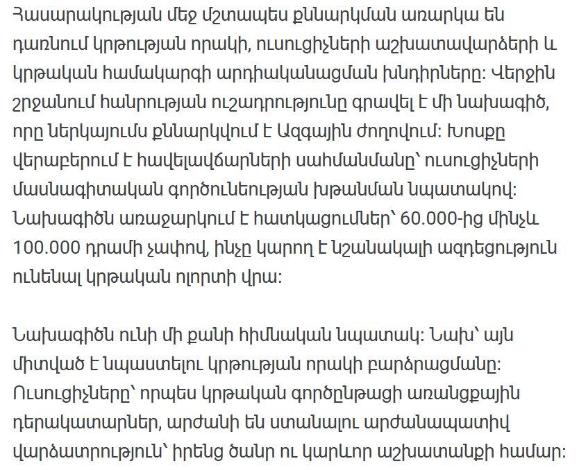 Вопросы качества образования, заработной платы учителей, модернизации системы образования постоянно обсуждаются в обществе. Недавно внимание общественности привлек проект, который в настоящее время обсуждается в Национальной ассамблее. Речь идет об установлении дополнительных выплат для стимулирования профессиональной деятельности педагогов. Проект предполагает выделение от 60 000 до 100 000 драмов, что может оказать существенное влияние на сферу образования.