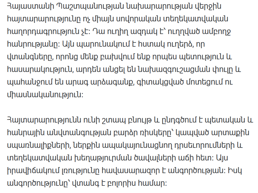 Последнее заявление Министерства обороны Армении — не просто рядовое информационное сообщение. Это прямой сигнал, адресованный всему обществу. В нем содержится четкое послание о том, что опасности, с которыми мы сталкиваемся как государство и общество, уже прошли стадию предупреждения и требуют быстрого реагирования, осознанного подхода и единства.