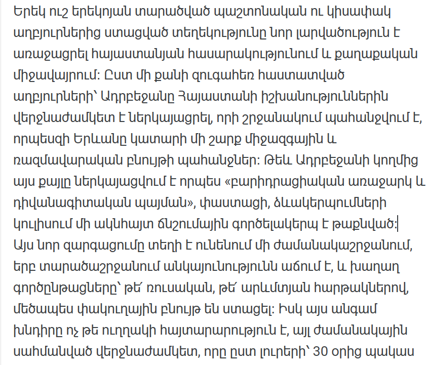 Это новое развитие событий происходит в то время, когда нестабильность в регионе растет, а мирные процессы как на российской, так и на западной платформах в значительной степени зашли в тупик. И на этот раз речь идет не о прямом заявлении, а об ограниченном по времени дедлайне, который, по сообщениям СМИ, оставляет армянской стороне менее 30 дней на ответ.