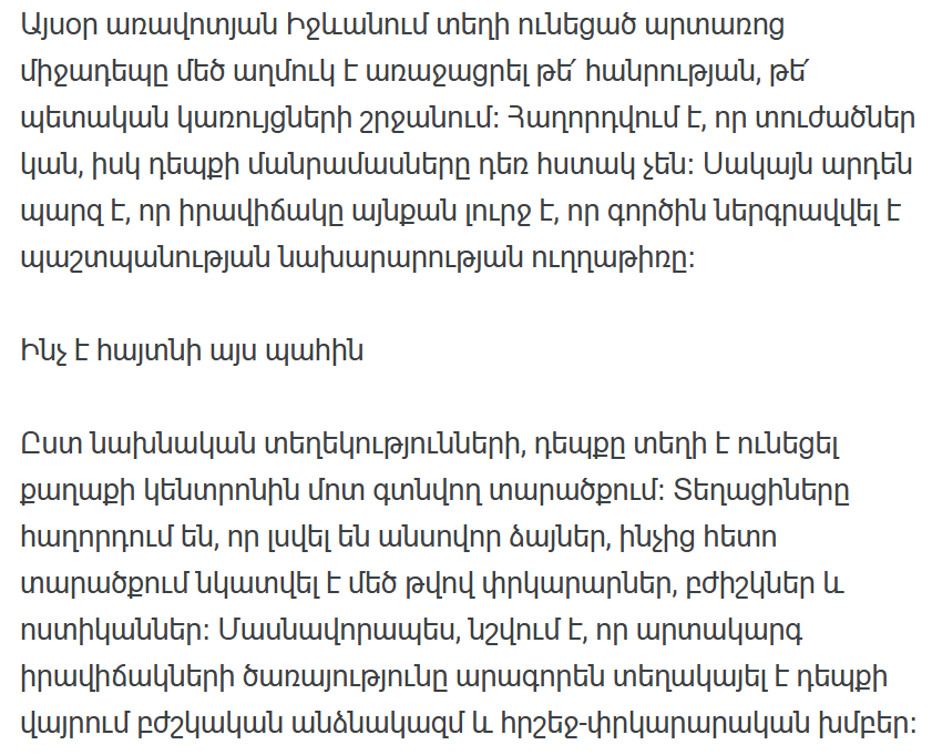 Странный инцидент, произошедший сегодня утром в Иджеване, вызвал большой резонанс как среди общественности, так и среди государственных учреждений. Сообщается о пострадавших, однако подробности инцидента пока не ясны. Однако уже сейчас ясно, что ситуация настолько серьезна, что к делу подключился вертолет Минобороны.