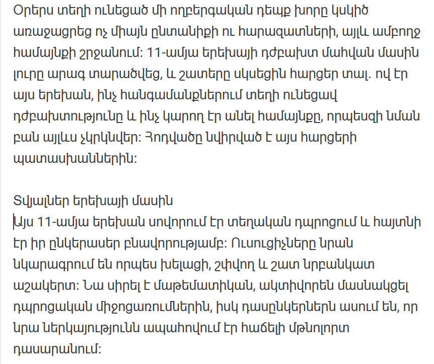 Этот 11-летний ребенок учился в местной школе и был известен своим дружелюбным характером. Учителя описывают его как умного, общительного и очень внимательного ученика. Он любил математику, активно участвовал в школьных мероприятиях, и его одноклассники говорят, что его присутствие создавало приятную атмосферу в классе.