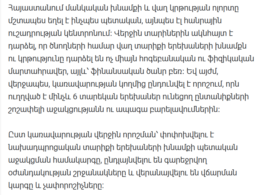 В Армении сфера ухода за детьми и раннего образования всегда была в центре внимания как государства, так и общественности. В последние годы стало очевидно, что уход за детьми раннего возраста и их воспитание стали для родителей не только психологическим и физическим испытанием, но и тяжелым финансовым бременем. И вот, наконец, правительство приняло решение, направленное на реальную поддержку и дальнейшее улучшение положения семей с детьми до 6 лет.