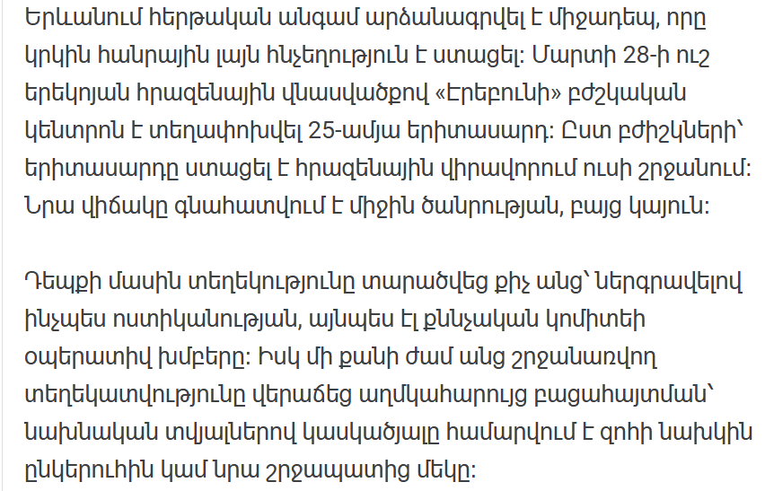 В Ереване зафиксирован очередной инцидент, который в очередной раз привлек широкое внимание общественности. Поздно вечером 28 марта в медицинский центр «Эребуни» с огнестрельным ранением был доставлен 25-летний мужчина. По словам врачей, молодой человек получил огнестрельное ранение в плечо. Его состояние оценивается как средней тяжести, но стабильное.