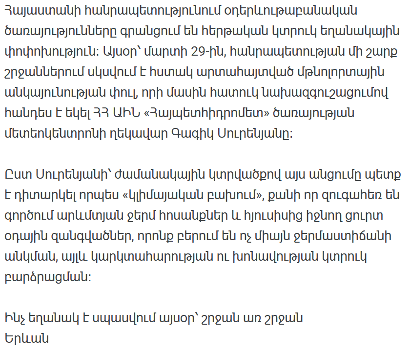 «Ожидается, что в горных районах сегодня вечером будут зафиксированы заморозки, которые могут повредить уже цветущие плодовые деревья». «В Араратской долине град может поразить посевы на открытых полях».