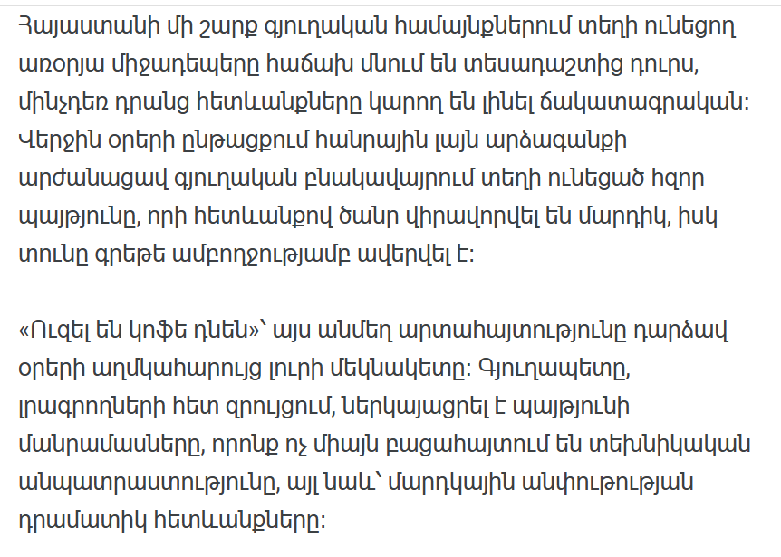 Повседневные инциденты, происходящие в ряде сельских общин Армении, зачастую остаются вне поля зрения, тогда как их последствия могут быть фатальными. В последние дни мощный взрыв в сельской местности привлек широкое внимание общественности, в результате чего серьезно пострадали люди и был практически полностью разрушен жилой дом.