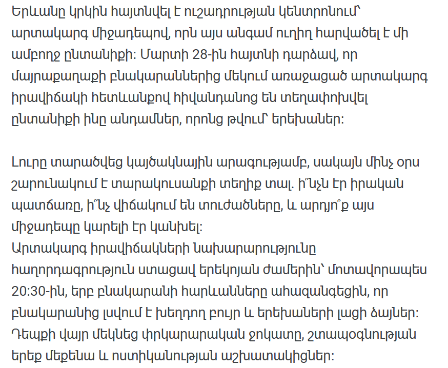 Ереван вновь оказался в центре внимания из-за чрезвычайного инцидента, который на этот раз напрямую затронул целую семью. 28 марта стало известно, что из-за чрезвычайной ситуации в одной из столичных квартир госпитализированы девять членов семьи, среди которых есть дети.