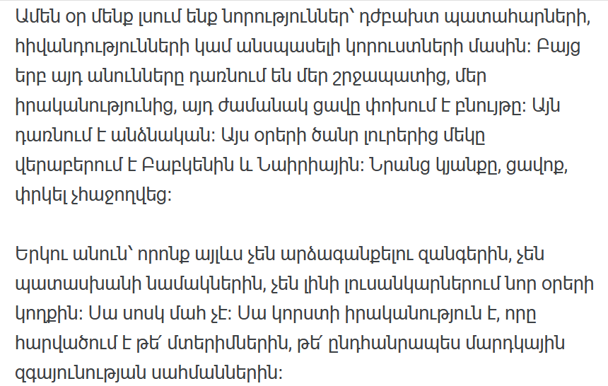 Когда два человека уходят из жизни одновременно, сердца родственников разделяются на несколько частей. Боль как будто удваивается. Бабкен и Наирия, вместе, без предупреждения, без прощания. Те, у кого было так много планов, чья жизнь еще продолжалась.