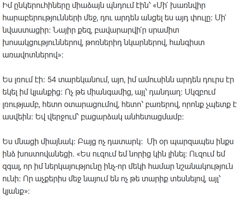 Я остался один. Но не пустой. Однажды я просто признался себе. «Я хочу снова стать женщиной». Я хочу чувствовать, что мое присутствие имеет значение для кого-то. «Чтобы они смотрели мне в глаза, видя не возраст, а жизнь».