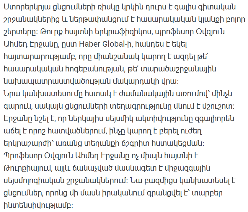 На данный момент ни один из официальных центров сейсмического мониторинга в Армении не подтвердил какой-либо конкретный прогноз землетрясений. Однако игнорировать заявление такого международного эксперта было бы также неправильно.