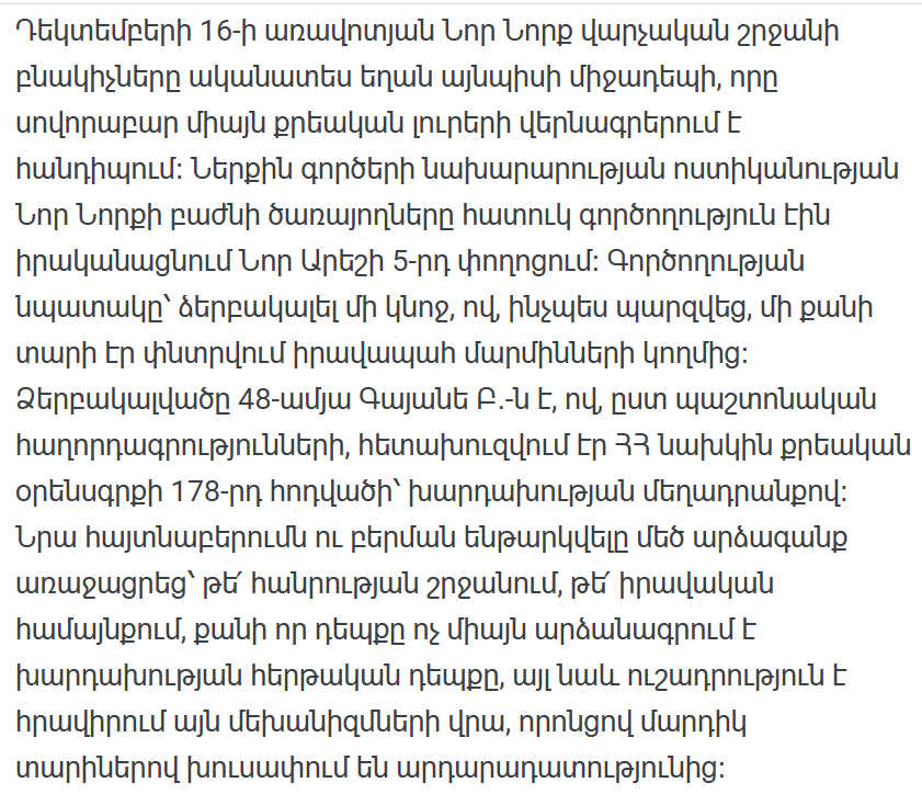 В ходе операции, проведенной 16 декабря, его нашли на 5-й улице в Нор-Ареше, в доме, где ранее было установлено оборудование для наблюдения. Акция была проведена без физического конфликта. Женщину мирно арестовали и доставили в полицейский участок Нор-Норк.