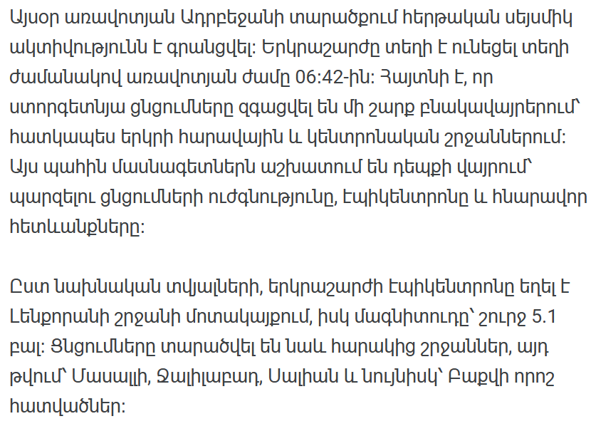 По предварительным данным, эпицентр землетрясения находился вблизи Ленкоранского района, магнитуда составила около 5,1 балла. Подземные толчки также распространились на соседние регионы, включая Масаллы, Джалилабад, Сальян и даже некоторые районы Баку.