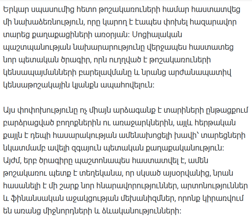 Пенсионер, проживающий в любой точке страны, может обратиться в свой региональный социальный отдел или воспользоваться электронной платформой gov.am, чтобы узнать о своих правах и активировать поддержку.