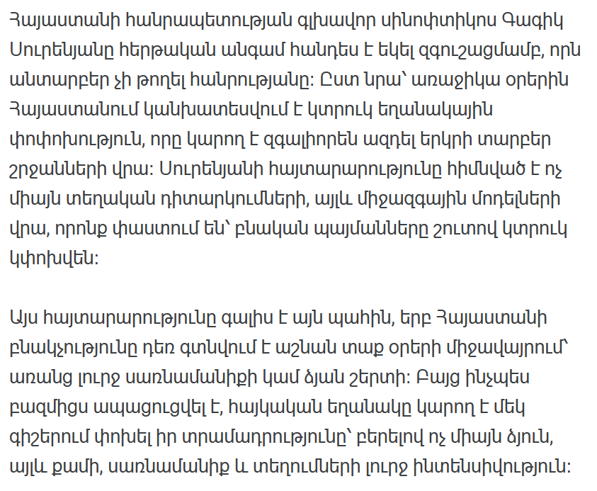 Это заявление прозвучало в то время, когда население Армении все еще переживает теплые осенние дни без серьезных заморозков или слоя снега. Но как было доказано много раз, армянская погода может за одну ночь изменить свое настроение, принеся с собой не только снег, но и ветер, мороз и значительную интенсивность осадков.