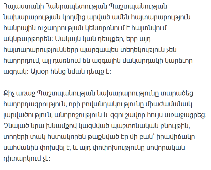 Каждое заявление Министерства обороны Республики Армения мгновенно оказывается в центре внимания общественности. Однако бывают случаи, когда подобные заявления не просто передают информацию, а становятся важным сигналом на национальном уровне. Сегодня как раз такой случай.