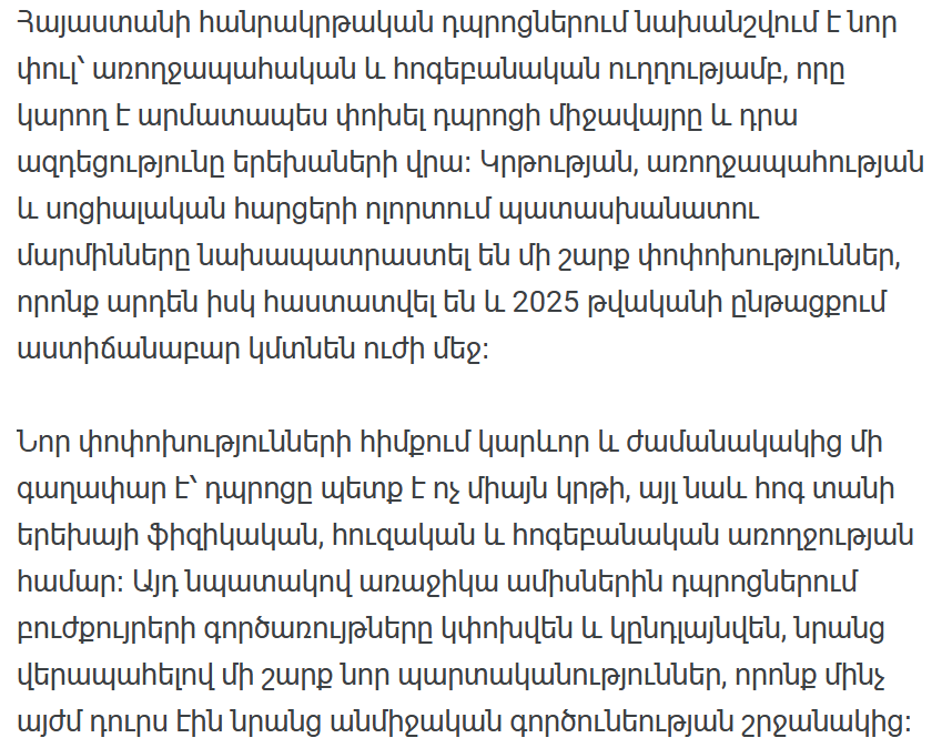 В государственных школах Армении наступает новый этап в сфере здравоохранения и психологического направления, который может кардинально изменить школьную среду и ее влияние на детей. Органы, отвечающие за образование, здравоохранение и социальные вопросы, подготовили ряд изменений, которые уже одобрены и постепенно вступят в силу в течение 2025 года.