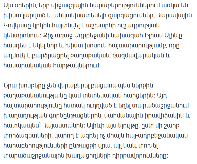 Его слова не касались исключительно внутренней политики или экономических вопросов. Это заявление было явно направлено против мирных процессов в регионе, ситуации на границе и особенно против Армении. По мнению ряда экспертов, это выступление Алиева может повлиять не только на ход армяно-азербайджанских отношений, но и изменить позиции региональных игроков.