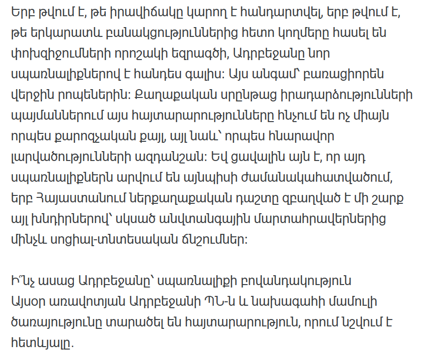 Армения переживает трудный и уязвимый период. Решение внутренних проблем, обеспечение безопасности границ и реструктуризация внешней политики требуют не только государственной, но и общественной сплоченности. Когда Азербайджан угрожает, это направлено не только против правительства. Это адресовано всем нам.
