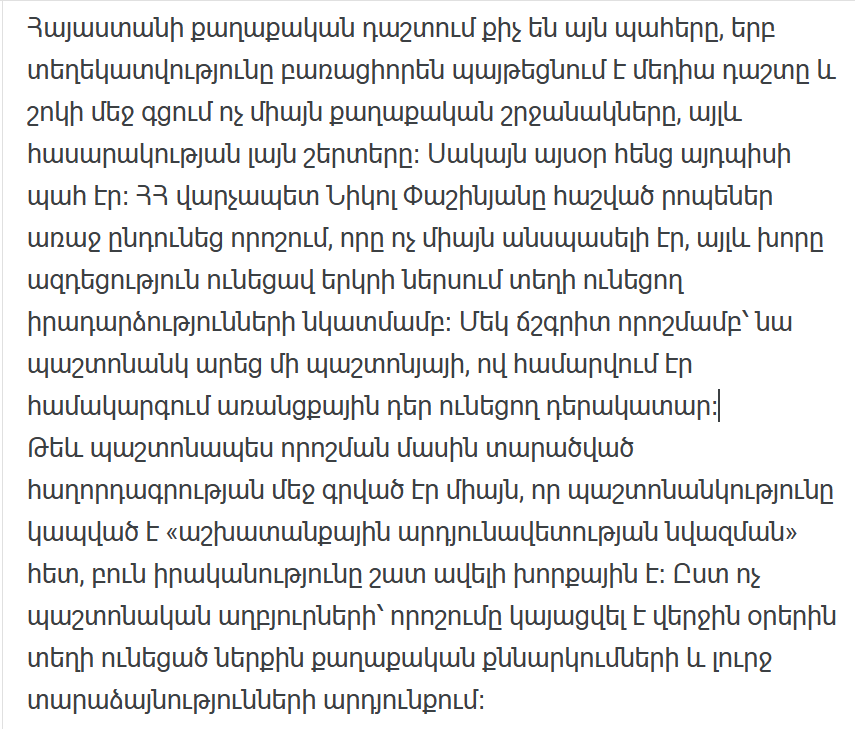Сегодня информация распространяется быстрее, чем когда-либо. Когда решение было обнародовано, оно сразу же стало темой номер один в СМИ и социальных сетях. Все говорили об этом, пытаясь понять, что же происходит на самом деле. Это еще одно доказательство того, что общество в Армении активно, заинтересовано и не ограничивается официальной новостной лентой.