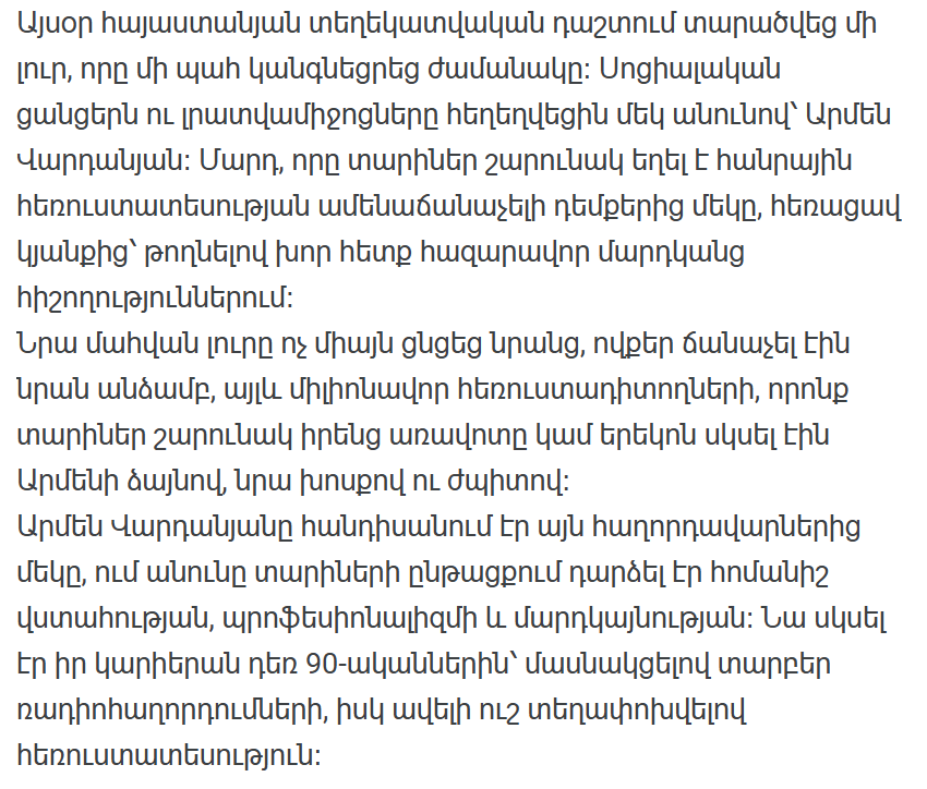 Сегодня в армянском информационном поле распространилась новость, которая на мгновение остановила время. Социальные сети и СМИ заполонило одно имя: Армен Варданян.