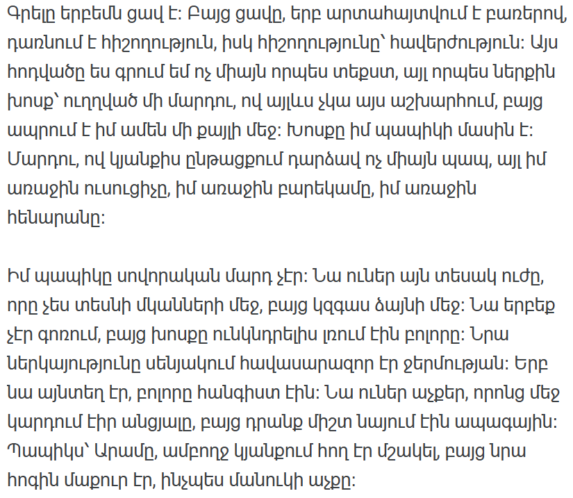 Мой дедушка был необычным человеком. У него была такая сила, которую не видно по его мускулам, но можно почувствовать по его голосу. Он никогда не кричал, но все замолчали, слушая его речь. Его присутствие в комнате было равносильно теплу. Когда он был там, все молчали. В его глазах можно было прочесть прошлое, но они всегда были устремлены в будущее. Мой дед Арам всю свою жизнь работал на земле, но душа его была чиста, как глаз ребенка.