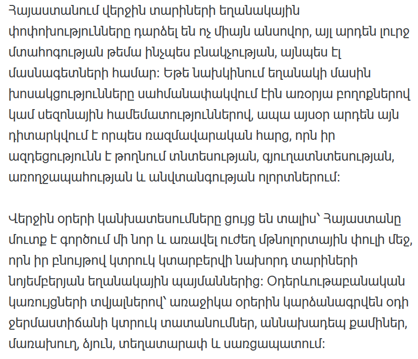 Изменения погоды в Армении в последние годы стали не только необычным явлением, но и предметом серьезной обеспокоенности как населения, так и специалистов. Если раньше разговоры о погоде ограничивались повседневными жалобами или сезонными сравнениями, то сегодня это уже считается стратегической проблемой, которая оказывает влияние на экономику, сельское хозяйство, здравоохранение и секторы безопасности.