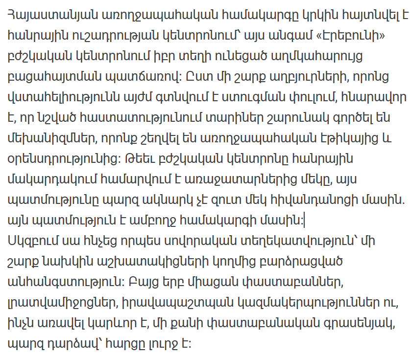 Система здравоохранения Армении вновь оказалась в центре внимания, на этот раз из-за скандального разоблачения, якобы имевшего место в медицинском центре «Эребуни».