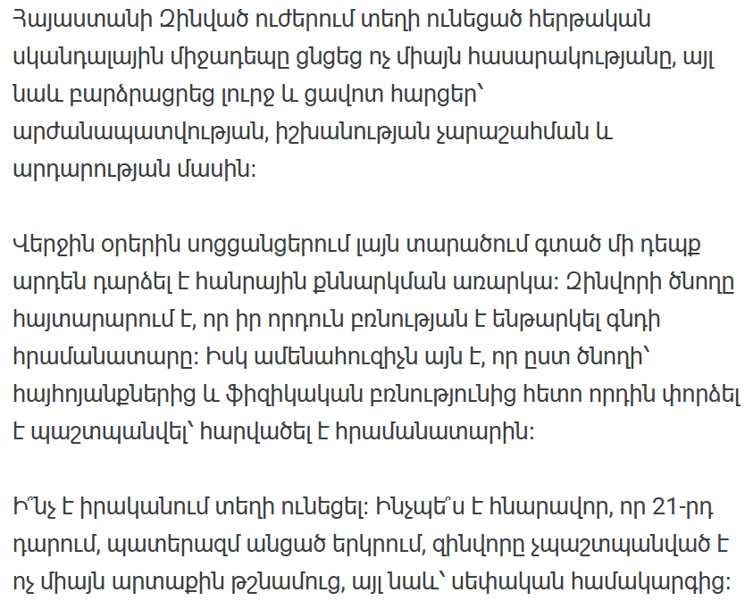 Очередной скандальный инцидент в Вооруженных силах Армении не только потряс общество, но и поднял серьезные и болезненные вопросы о достоинстве, злоупотреблении властью и справедливости.