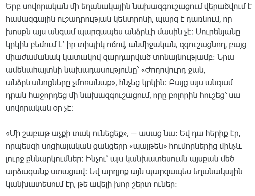 «Дорогие люди, не забывайте зонтики и не говорите потом: «Суренян этого не говорил». Это будет ужасно. «Понаблюдайте за ним в течение недели». Несколько слов, простое предупреждение, сказанные спокойно, но прямо, и все население Армении становится центром внимания. Новый прогноз Гагика Суреняна в очередной раз превратился не только в погодное предупреждение, но и почти общенациональный сигнал общественных настроений.