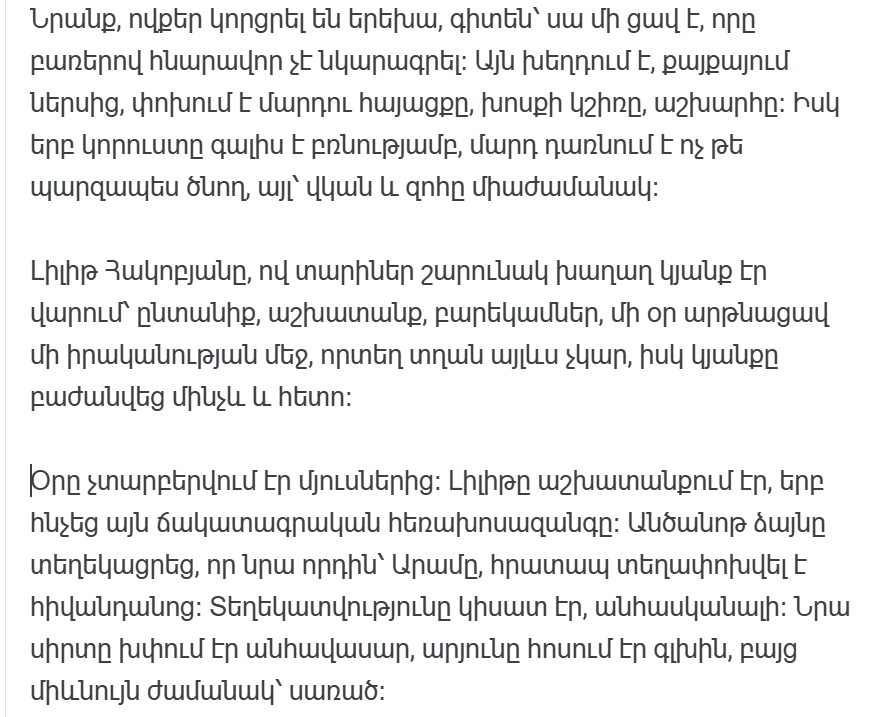 Лилит Акопян, которая долгие годы вела мирную жизнь — семья, работа, друзья — однажды проснулась в реальности, где ее сына больше нет, а ее жизнь разделилась на до и после.