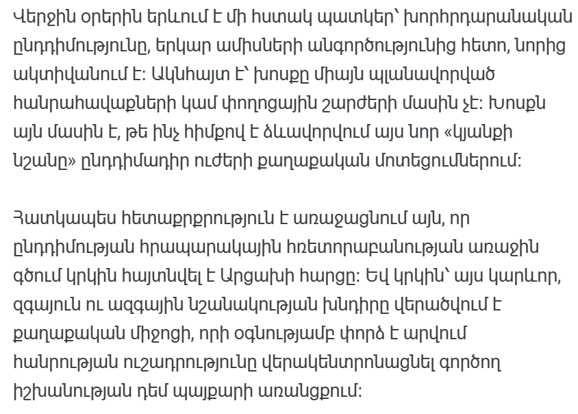 В последние недели во внутриполитической жизни Армении зафиксирован новый этап активности оппозиции. Парламентская оппозиция, которую ряд аналитиков ранее характеризовали как «самоизолировавшуюся», похоже, набирает новые обороты, пытаясь вернуться к логике уличной борьбы. Этот процесс сопровождается классической схемой: резкая критика властей, введение чрезвычайного положения и, что самое главное, активная спекуляция на теме Арцаха.