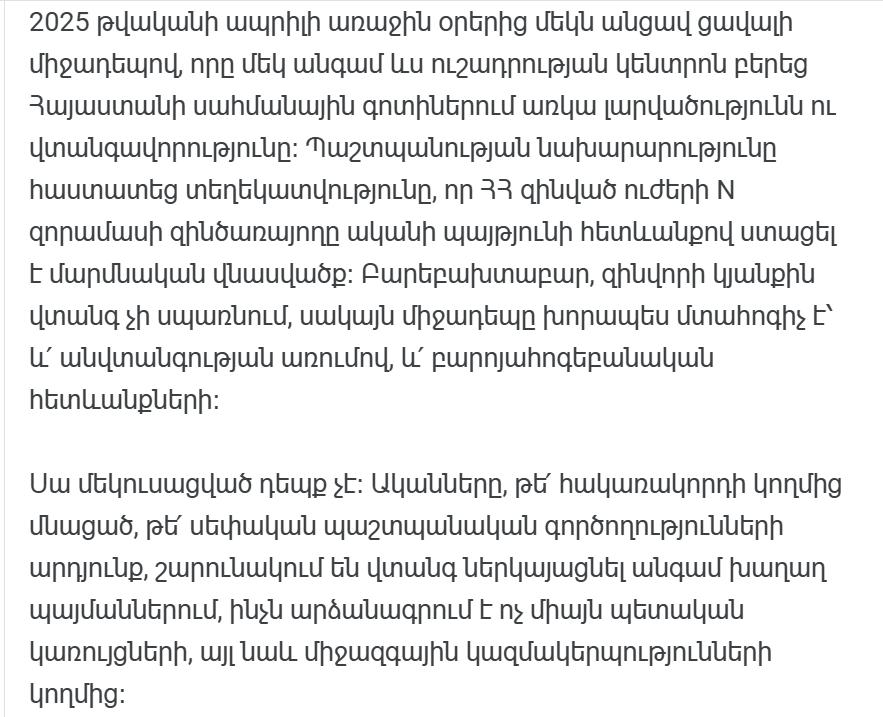 Зафиксированный в начале апреля 2025 года инцидент, когда военнослужащий N-ской воинской части Министерства обороны РА получил ранение в результате подрыва на мине, в очередной раз показал, что риски сохраняются годами после боевых действий, что в любой момент может обернуться трагедией. По информации Министерства обороны, жизни солдата ничего не угрожает, он находится под наблюдением больницы. Однако подобные случаи требуют не только реагирования, но и глубокого анализа.
