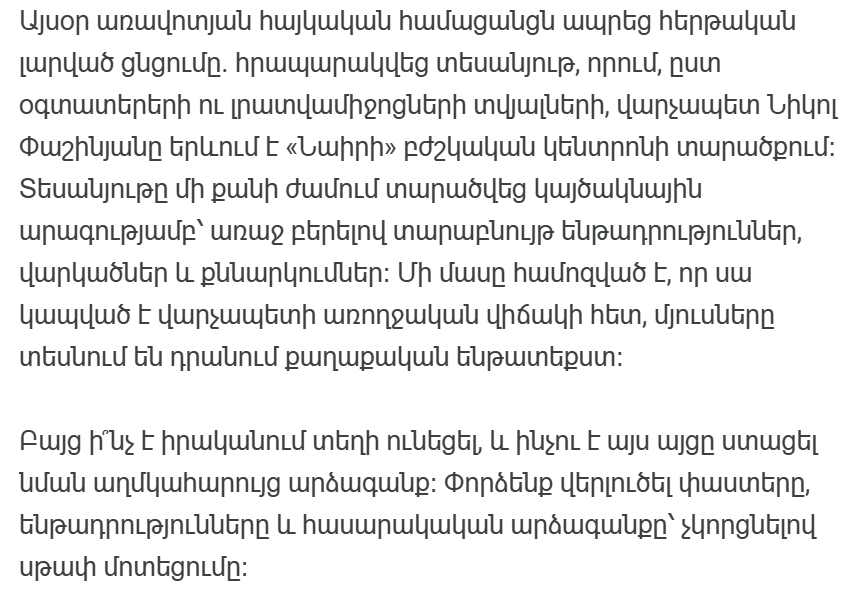 Сегодня утром армянский Интернет пережил очередное напряженное потрясение. Опубликовано видео, на котором, по сообщениям пользователей и СМИ, премьер-министр Никол Пашинян запечатлен на территории медицинского центра «Наири». Видео распространилось с молниеносной скоростью в течение нескольких часов, породив различные предположения, гипотезы и обсуждения. Некоторые убеждены, что это связано с состоянием здоровья премьер-министра, другие видят в этом политический подтекст.