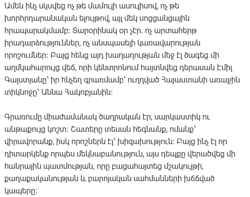 Все началось не с пресс-конференции, не с парламентской речи, а с одного поста в социальных сетях. Это был не странный день. никаких чрезвычайных событий, никаких неожиданных решений правительства. Но именно в этом мире и возник скандальный спор, в центре которого оказался актер Эмиль Галстян с его резонансной нотой, адресованной первой леди Армении Анне Акопян.