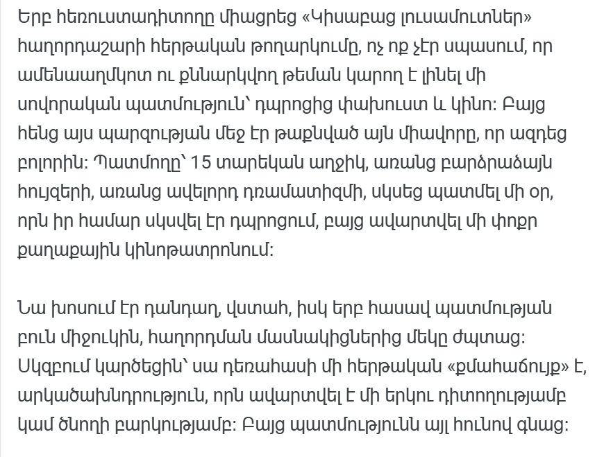 Когда зритель включил очередной выпуск программы «Приоткрытые окна», никто не ожидал, что самой обсуждаемой и обсуждаемой темой станет рядовая история: побег из школы и поход в кино. Но именно в этой простоте и таилось то единство, которое затрагивало всех. Рассказчица, 15-летняя девочка, без громких эмоций, без лишнего драматизма начала рассказывать историю одного дня, который начался для нее в школе, а закончился в маленьком городском кинотеатре.