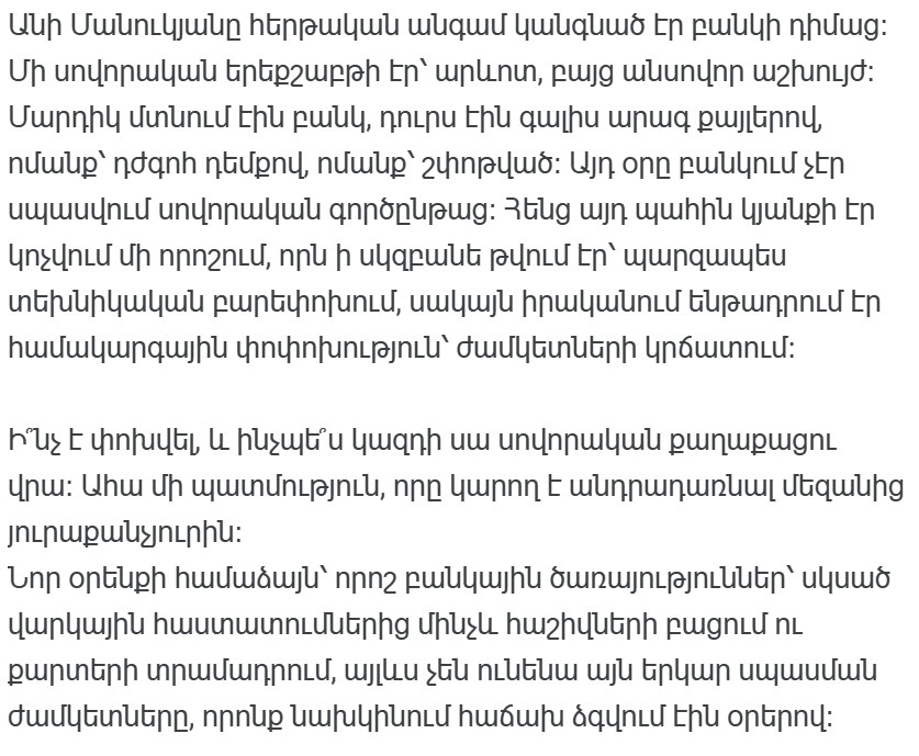 Ани Манукян снова стояла перед банком. Это был обычный вторник, солнечный, но необычайно оживленный. Люди входили в банк и выходили быстрыми шагами, некоторые с недовольными лицами, некоторые с растерянными лицами. В тот день в банке не ожидалось никаких обычных действий. В этот самый момент реализовывалось решение, которое изначально казалось просто технической реформой, но на самом деле подразумевало системное изменение: сокращение сроков.