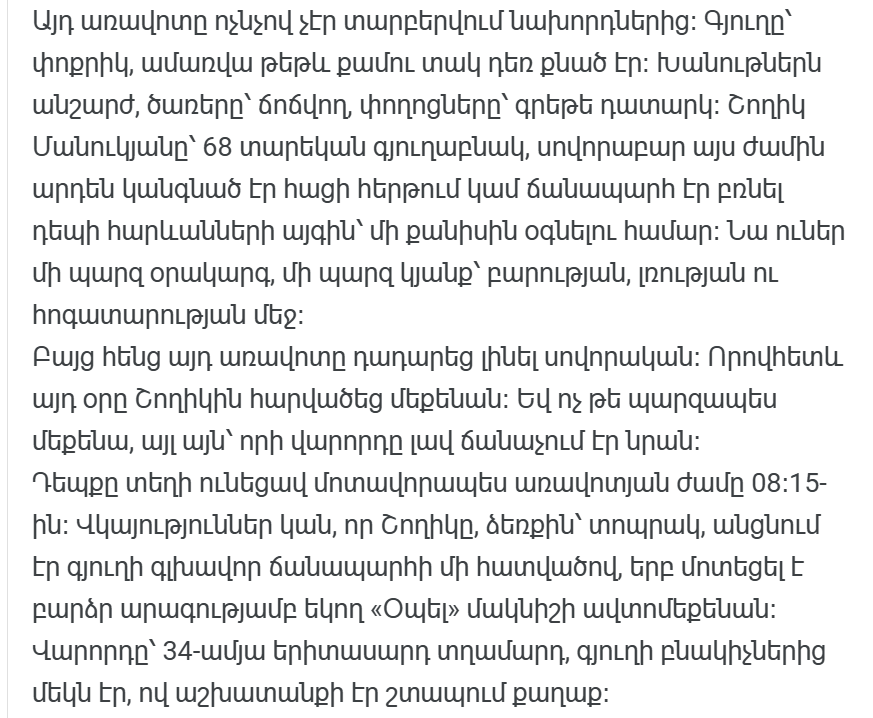 В местной школе учителя объясняли детям, почему важно осторожно переходить улицу. В магазине, по дороге к которому произошел инцидент, люди обсуждали только одно. Никто не верил, что это случилось с Шогик.