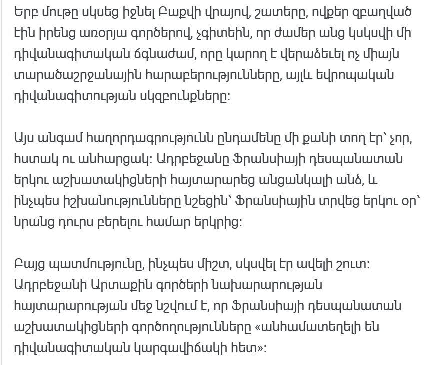 На этот раз послание состояло всего из нескольких строк: сухих, ясных и не вызывающих вопросов. Азербайджан объявил двух сотрудников французского посольства персонами нон грата, и, как отметили власти, Франции дали два дня на их выдворение из страны.