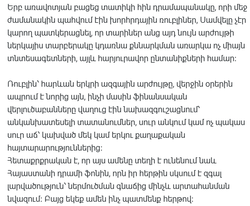 Все началось совершенно обычным утром. Новость еще не успела полностью распространиться, а цифры на электронных табло ереванских обменных пунктов уже беспокойно двигались. За считанные секунды курс рубля резко упал. Десятки граждан стали звонить друзьям и родственникам, спрашивая одно и то же: «Менять или подождать?»