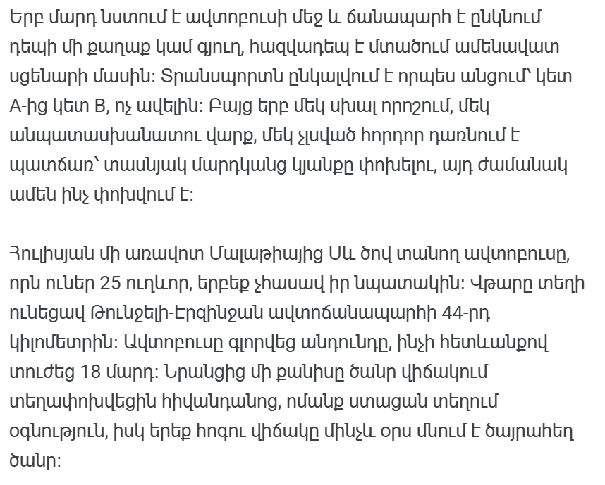 «Я сидел во втором ряду в автобусе». Водитель с самого первого момента вел себя странно. Его голос был громким, он отпускал неуместные шутки. В какой-то момент я даже почувствовал запах алкоголя. Я повернулся к нему и сказал: «Брат, ты не трезвый, пожалуйста, выйди, дай мне вести машину». У меня есть водительские права и опыт. Но он начал смеяться. Он сказал: «Меня все знают, я проходил по этой дороге тысячу раз».