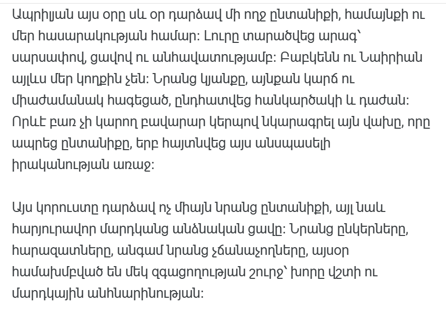 Потеря Бабкена и Наирии не только личная. Это напоминание обществу о том, что мы живем в уязвимой реальности. Что каждый человек, будь то простой педагог, сельский активист или просто хороший человек, имеет значение. Когда эти люди уходят, даже не успев реализовать все свои планы, мы все теряем частичку своего будущего.