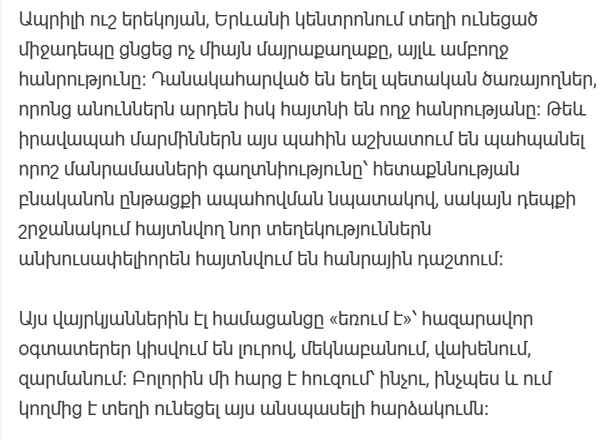 Нападение, произошедшее в самом центре Еревана поздно вечером 14 апреля, уже считается одним из самых шокирующих инцидентов за последние годы. По данным различных достоверных источников, нападениям подверглись представители власти, лица, имена которых давно известны общественности. На данный момент правоохранительные органы отказываются разглашать все подробности, однако уже сейчас очевидно, что это не рядовой инцидент, а серьезное организованное преступление.