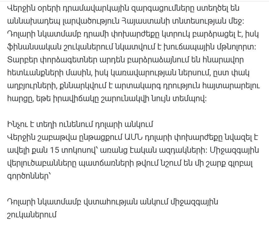 Всего за несколько дней курс доллара США по отношению к армянскому драму упал более чем на 15 процентов. Цены покупки и продажи в обменных пунктах колеблются в нестандартном диапазоне, создавая ситуацию, когда граждане, инвесторы и предприятия просто не понимают, в какой валюте доверять свои деньги.
