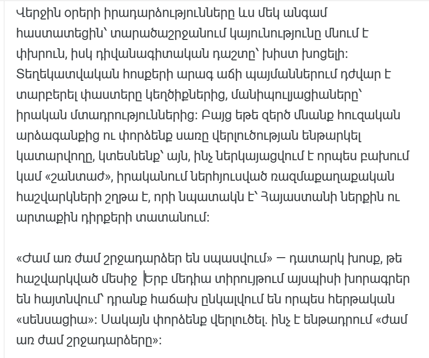 Однако параллельно с этим открывается и другая правда: некоторые части политического руководства Армении, находясь в уязвимом положении по отношению к внешнему влиянию, стремятся продвигать собственную повестку дня даже по таким деликатным вопросам, как безопасность. А когда безопасность становится предметом политических спекуляций, суверенитет страны оказывается под угрозой.