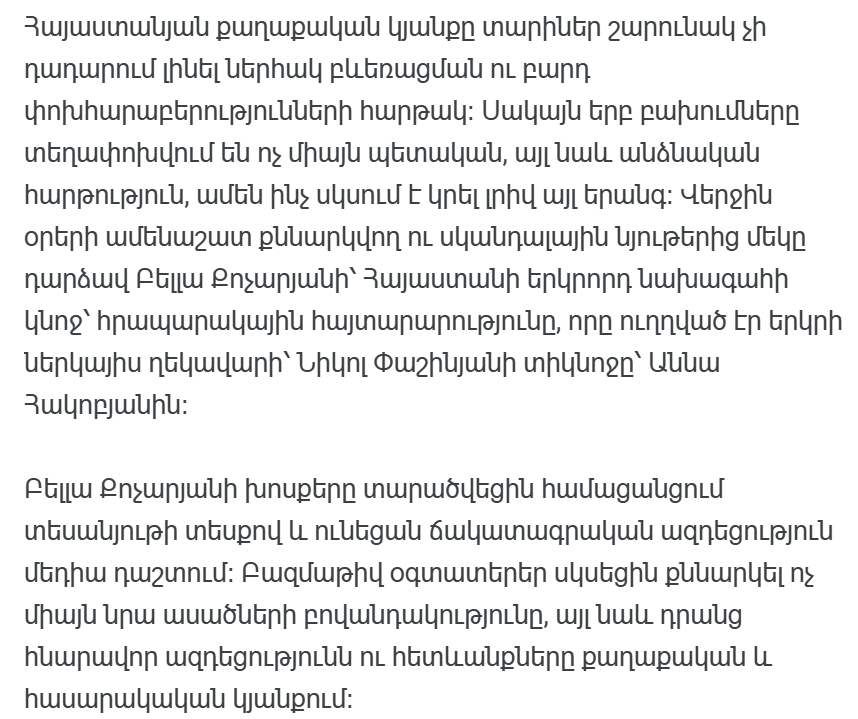 Выступление Беллы Кочарян является важным прецедентом: впервые на армянской политической арене столь остро сталкиваются не власть и оппозиция, а две «первые леди». Это свидетельствует о том, что персонализация политики углубляется, проникая в сферы, которые ранее считались относительно «чистыми» — отношения между женщинами в правящих семьях.